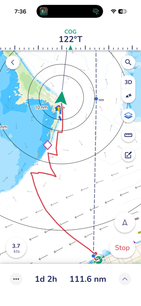We then proceeded to follow the south side of Freeport and make our way across to another shipping area where I accidentally put us smack into the restricted zone. It was very early in the morning and not much was happening thankfully, but the wind was making it hard for us to go anywhere else. After these 2 events before I make any navigation decisions based on just the land, wind and weather Im adding checking the shipping routes and traffic apps.