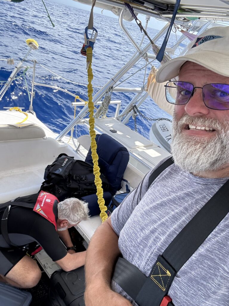We had a lot of boat tweaks to make as we were going along. The boat has not been sailed for a long time and while its sound, there are things not set up correctly. The reef points for example were on the sail, but misconfigured. We had to climb up and get those sorted out on the ocean. Luckily we had a calm day the next day to do just that. Climbing up on the hard top is not hard, but there’s an interesting element of danger added when your in the middle of the ocean.