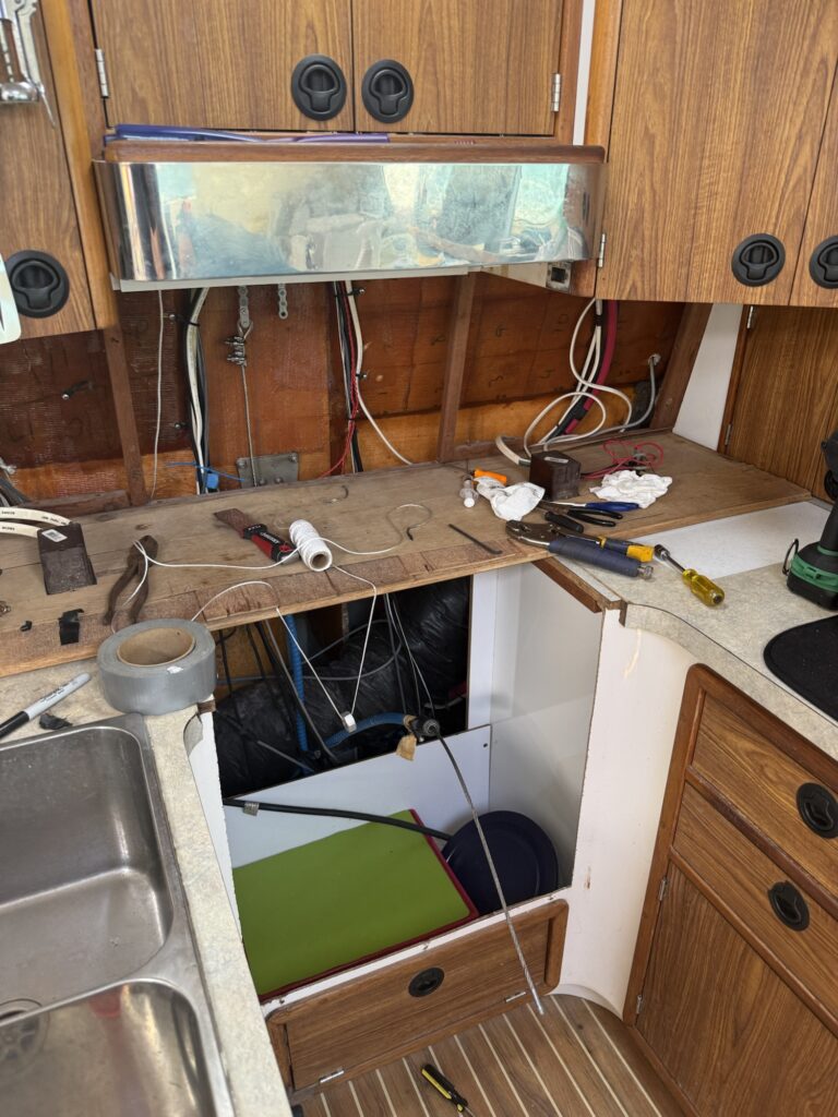 day 3 of repairs we tore into the inside of the boat and had to take out the oven because the cables were run behind the galley area. We did the same process with these cables and got them cleaned out and new cable run. We replaced all the steering cables and the steering feels 100% better. We’re going to do a full sail test today and see how they go. We will then make a decision about our exit window and get moving again toward our final stop. St. Thomas.